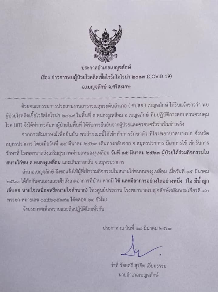 วันที่ 19 มี.ค. ว่าที่ร.ต.สุรจิต เอี่ยมธรรม นายอำเภอเบญจลักษ์ จ.ศรีสะเกษ ได้ออกประกาศอำเภอเบญจลักษ์ เรื่อง ข่าวการพบผู้ป่วยโรคติดเชื้อไวรัสโคโรนา 2019 (COVID-19) อ.เบญจลักษ์ จ.ศรีสะเกษ