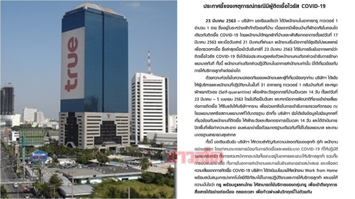วันที่ 3 มี.ค. บริษัท ทรู ได้ประกาศชี้แจงเหตุการณ์กรณีมีผู้ติดเชื้อไวรัส COVID-19 โดยระบุว่า วันที่ 23 มีนาคม 2563 - บริษัทฯ ขอรียนชี้แจงว่า ได้มีพนักงานในอาคารทรู ทาวเวอร์ 1 จำนวน 1 ราย ซึ่งอยู่ระหว่างเฝ้ากักตัวเองที่บ้าน เนื่องจากมีเพื่อนบ้านที่พักอาศัยในคอนโดเดียวกันติดเชื้อ COVID-19 โดยพนักงานได้หยุดพักที่บ้านและเฝ้าสังเกตอาการตั้งแต่วันที่ 17 มีนาคม 2563 และเมื่อวันเสาร์ที่ 21 มีนาคม ที่ผ่านมา พนักงานเริ่มมีอาการไข้สูงจึงไปพบแพทย์เพื่อตรวจหาเชื้อ