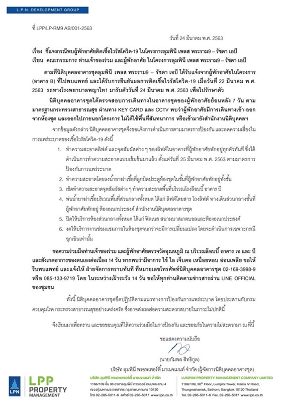 โควิด-ลุมพินี / วันที่ 25 มี.ค. บริษัท ลุมพินี พรอพเพอร์ตี้ มาเนจเมนท์ จำกัด เผยแพร่หนังสือถึงคณะกรรมการ ท่านเจ้าของร่วม และผู้พักอาศัย ในโครงการลุมพินี เพลส พระราม9-รัชดา เอบี เรื่อง ชี้แจงกรณีพบผู้พักอาศัยติดเชื้อไวรัสโควิด-19 ในโครงการลุมพินี เพลส พระราม9-รัชดา เอบี ระบุว่า ตามที่นิติบุคคลอาคารชุดลุมพินี เพลส พระราม9-รัชดา เอบี ได้รับแจ้งจากผู้พักอาศัยในโครงการ (อาคารบี) ที่ไปพบแพทย์ และได้รับการยืนยันผลการติดเชื้อโควิด-19 เมื่อวันที่ 22 มี.ค.2563 รถทางโรงพยาบาลพญาไท1 มารับตัววันที่ 24 ทัซึซ2563 เพื่อไปรักษา